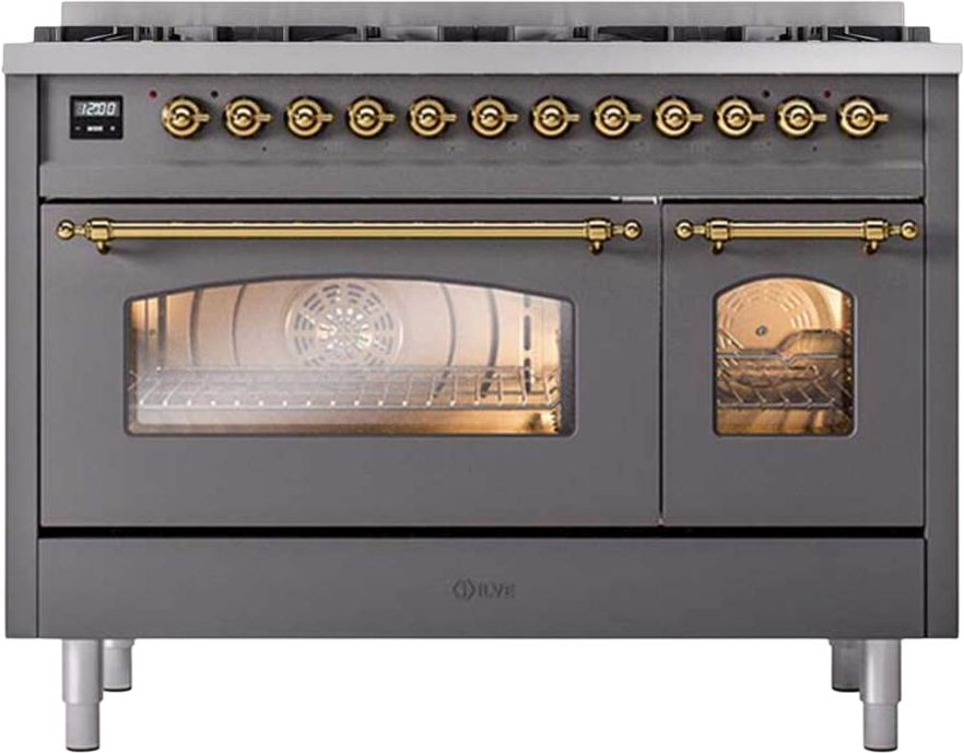 Introducing the new Nostalgie II 48" dual fuel range, a classic addition with a touch of innovation to any kitchen. This range feature sealed burners equipped with total black brass burner that has a non-stick nanotechnological coating, heavy cast iron grates, 3.5 + 1.52 cu. ft. total double oven capacity and soft closing door system.Read More