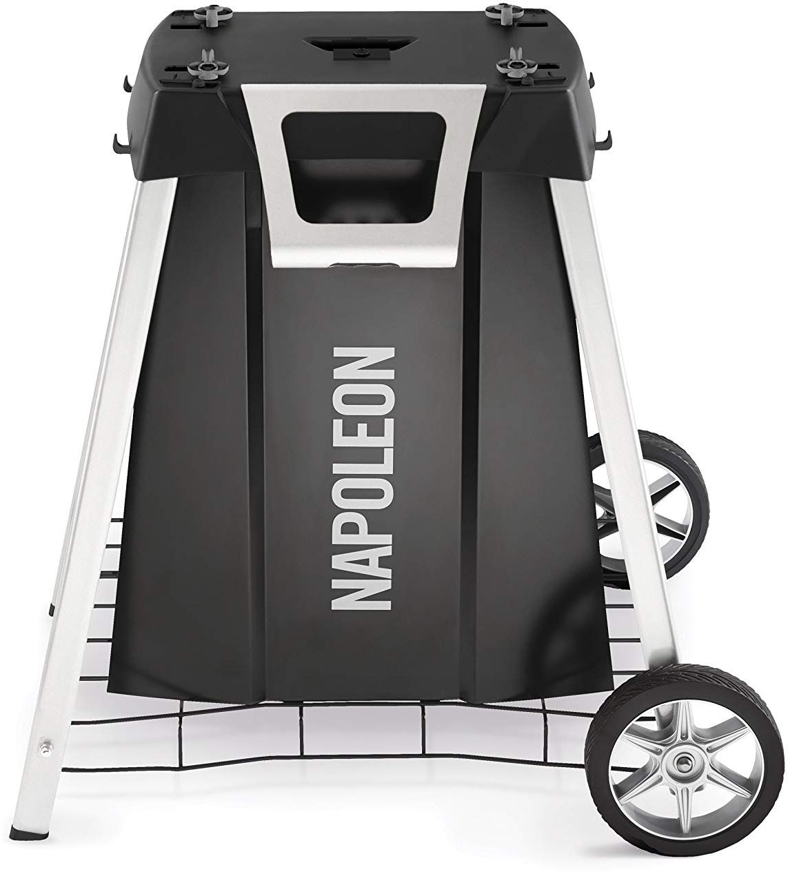 The Napoleon TravelQ™ Cart comes with all of the benefits of a full sized cart grill. Stylish front that hides the propane tank, the removable side shelves and powder coated steel frame. It has the stainless steel condiment shelf, tool hooks and towel bars, as well as manual.