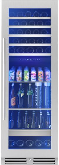 Keep wine, beer, soda, juice and more on hand and ready to drink in this Full Size Wine & Beverage Cooler. Featuring Full-Extension Wood Racks for bottle storage, a stainless steel Full-Extension Rollout Bin for easy access, vertical LED light strips in three colors and four light levels, an illuminated control panel, and an updated kickplate with built-in lock.Read More